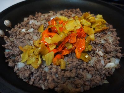 Use the non-stick skillet that was used to prepare the potato slices and brown the ground beef. If necessary drain any excess oil from the ground beef. Add the diced onion and saute until it is soft and translucent. Season with green chile seasoning and add chopped chiles. Stir until well combined. Set aside.