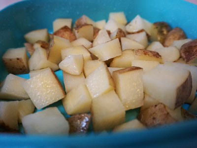 When you are ready to start, cut up 2 large potatoes into big cubes.  Don’t worry about peeling them unless you want to.  Place the cubed potatoes in a microwave safe bowl. Drizzle with olive oil and microwave on high for 2 minutes per potato.