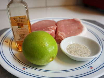 A couple hours prior, I made a marinade for the pork chops consisting of lime juice, red chile olive oil, as well as a salt, pepper and garlic powder blend.