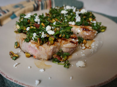 • Grilled Pork Chops with Red Chile Pistachio Chimichurri