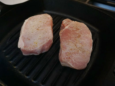 Heat a cast iron grill over high heat at least 5 minutes prior to adding the pork chops.  Cast iron takes time to heat up and you want the grill nice and hot before adding the pork chops.  If needed, add a drizzle of red chile olive oil to each chop so that they will not stick to the griddle.  Don’t pour the oil onto the grill, it needs to be on the pork itself and will make it easy to turn it without sticking.