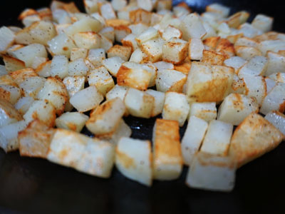 Heat a tablespoon of bacon grease or olive oil in a 10 inch skillet over medium high heat. When the oil is hot add the potatoes to the pan and space out in a single layer. Season the potatoes with salt, pepper and garlic powder and let cook for several minutes as they begin to brown.