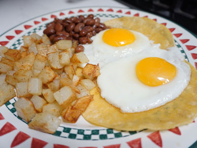 The eggs have cooked just a bit more so that they are perfectly cooked sunny side up. The potatoes and beans are nice and hot with a little melted cheese on top. Garnish with some shredded lettuce and chopped tomato.