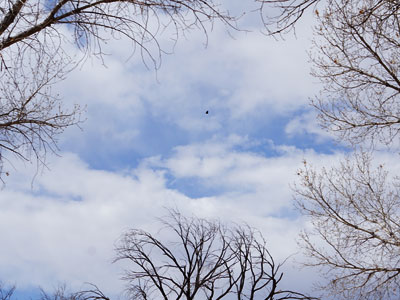 We wandered into an area with trees surrounding us. I looked up to see the tree tops framing a crow soaring above.