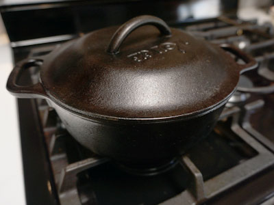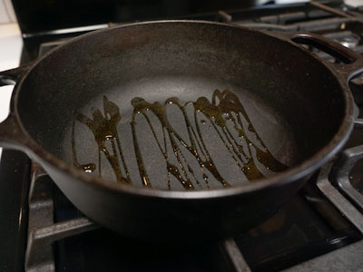 I have a small 1 1/2 quart dutch oven that I like to use for small dishes, but you could also use a cast iron skillet with a lid. Heat it over medium high heat with a drizzle of olive oil.