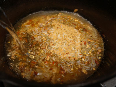 Pour half the mix (1/2 cup) into the skillet. In the mix is rice with dehydrated chiles, dehydrated veggies and spices.