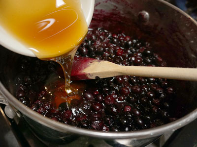 Once the pectin has completely been incorporated, it’s time to add the honey. You should notice the jam begin to thicken even more as you continue to stir.