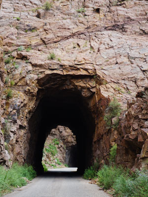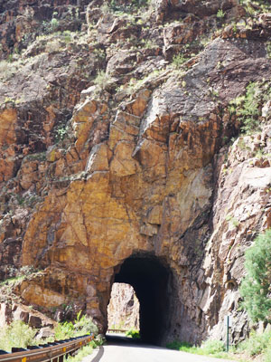Gilman Tunnels are one of the few man made wonders in the Jemez Mountains. Named for Santa Fe Northwestern Railways executive William H. Gilman, the two tunnels were built in the early 1920’s through mountains of granite. The rail line began construction and laid tracks in 1924 to haul timber to a sawmill in Bernalillo. Heavy rain caused flooding which damaged bridges and washed away some of the tracks that caused such damage that the rail line simply abandoned it rather than spend the money to repair it. Now paved, the narrow road is used to travel through a rugged section of the Guadalupe Box Canyon. But many take the road just to see the historic tunnels. To get there take Hwy 485 west off of Hwy 4 from either direction. Travel on Hwy 485 for 5 1/2 miles where you can drive through the tunnels or there is designated parking before you enter the tunnels on either side of the road.
