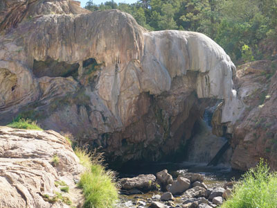 The Jemez Soda Dam is a unique sight. It was formed by calcium carbonate and travertine deposits from thermal spring water that has built up over many years. The Jemez river flows through the dome which has created a bridge across it. The soda dam is located on Hwy 4 just north of the Village of Jemez Springs and Jemez Historic Site.