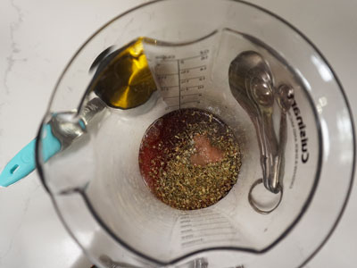 To make dressing, combine all Greek dressing ingredients into a measuring cup and blend 10 seconds with a hand blender. Pour into a half pint jar, secure with a lid and refrigerate. Makes 1 cup.