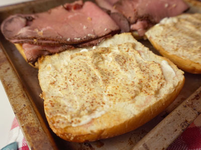 Move your roast beef over top of your melted cheese. Spread mayonnaise and deli mustard on the other side of the roll.