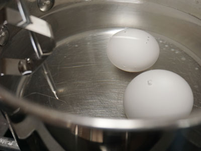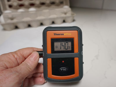 Now that you have your consistent temperature, it’s time to gently lower the eggs into the water. This is not boiling water so you won’t see much except a few tiny air bubbles escape. Place the eggs in the 140 degree water for 3 minutes. If using extra large eggs, let them sit for 5 minutes at 140 degrees.