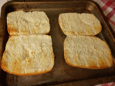 One thing that is hard to beat is Dion’s crusty rolls that they make their subs with. I can’t duplicate them but I did find a way to create a toasty crunchy roll by toasting them on both sides. I picked up some deli rolls from our local grocery store which were just the right size for Joe and me. Cut them in half and place in your toaster oven and toast until they are nice and warm and just beginning to turn golden brown.
