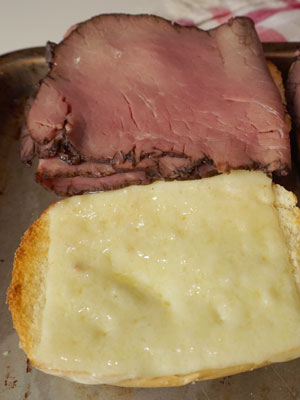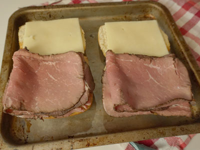 Now place the subs back in the toaster oven under the broiler setting. Leave under the broiler just until the cheese melts and begins to bubble. This will also warm the roast beef for your sandwich.