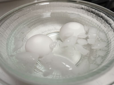 Once the 3 minutes are up you can remove the eggs to an ice bath which will stop the cooking process. Let them sit in the ice bath for a couple minutes, then dry them off with a kitchen towel and return to the refrigerator until time to use.
