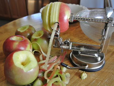 This pie filling includes 4 cups of sliced apples. I have an apple peeler that make preparing the apples much easier than peeling by hand.