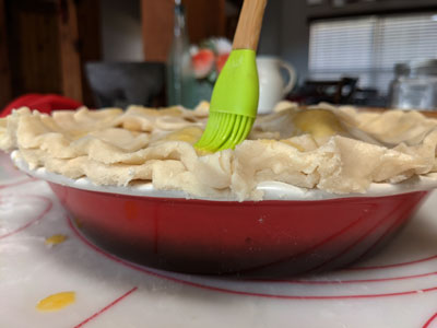 Before you place the top pie crust on top, dot the pie with about 2 tablespoons of butter that has been sliced thin. Trim the edges and press the two pie crusts together and pinch together.