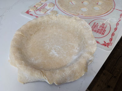 When you are ready to make the pie, let the refrigerated dough sit out to room temperature for 20 – 30 minutes. Generously sprinkle flour over your work surface. Roll out the dough to approximately 1/16 inch thickness to fit a 9 inch pie plate. Press the dough into the center and around the sides.