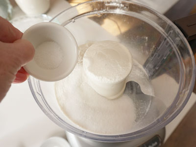 The pie crust I made is from Cook’s Illustrated’s Foolproof Pie Dough Recipe. Once I tried this recipe I’ve never gone back. It’s easier to work with and has a flaky texture that tastes so good. In a food processor, add 1 1/2 cups of flour along with your sugar and salt. Pulse a few turns to mix these dry ingredients together.