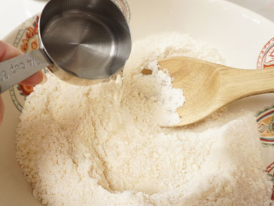 Sprinkle vodka and water, a little bit at a time over the mixture. Use a wooden spoon to mix and fold until the dough becomes slightly tacky and will stick together when pressed between your fingers.