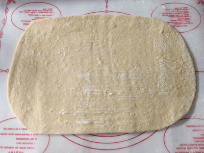 Sprinkle a generous amount of flour on your work surface, divide the dough in half and shape into 2 rectangles.