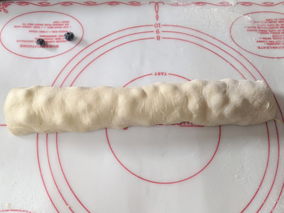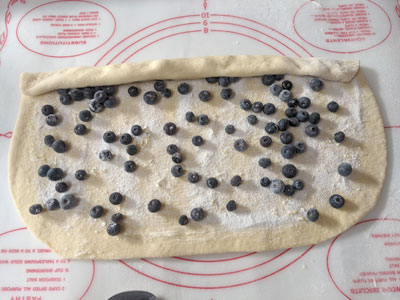Sprinkle half the sugar mix evenly over the dough leaving 1/2 inch around the borders. Sprinkle half of the blueberries evenly across the dough. Begin rolling along the long edge toward you. Roll it slowly capturing all those berries as you roll it up.