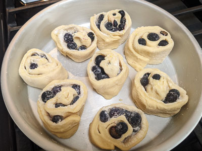They didn’t look very pretty when first cut and placed in the pan but when they rise and are baked, the blueberries and sugar spills over the edges of the dough to make some beautiful rolls. All they need is a lemon glaze over top.