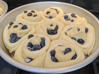 The filling for these rolls include frozen blueberries, sugar, cornstarch and lemon zest.