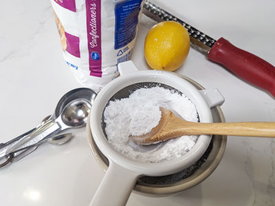 Sift the powdered sugar, add lemon juice, and zest plus 1 – 2 tablespoons of whole milk. Whisk all ingredients together to create a citrusy glaze.
