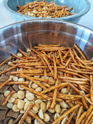 Measure out the chex cereals, pretzels and peanuts into a large bowl. You can add different varieties of nuts, cheese crackers, bagel chips, rye chips, dry breadstick broken into pieces, or other bite sized flavored crackers. Just adjust the amounts to equal 10 cups total.