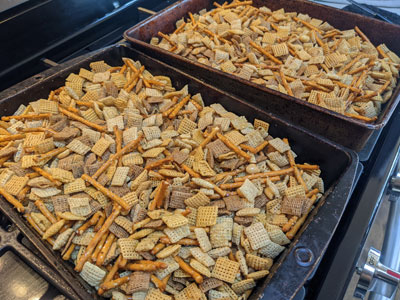 Note: To make a “Christmas” Chex Mix combine 1 teaspoon ground red chile and 1 teaspoon green chile powder in the spice blend. Any 10 cup combination of Chex mix cereal, nuts, cheese crackers, bagel chips, rye chips, dry breadstick broken into pieces, or other bite sized flavored crackers can be used in the Chex mix.