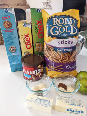 I used a combination of corn, rice and wheat chex cereals, pretzel sticks and peanuts. I also assembled butter to be melted, lime juice and lime zest plus a spice mix. I made a red chile spice blend with dried ground NM red chile, onion powder, garlic powder and salt. The green chile spice blend included NM green chile powder, onion powder, garlic powder and salt.