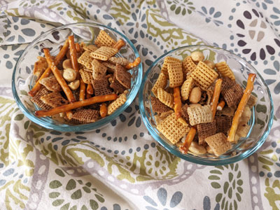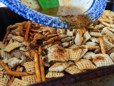 Note: To make a “Christmas” Chex Mix combine 1 teaspoon ground red chile and 1 teaspoon green chile powder in the spice blend. Any 10 cup combination of Chex mix cereal, nuts, cheese crackers, bagel chips, rye chips, dry breadstick broken into pieces, or other bite sized flavored crackers can be used in the Chex mix.