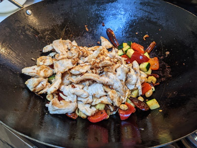 Add the zucchini, red pepper, peanuts and dried red chilis to the wok and saute for 2 – 3 minutes. It’s okay if the vegetables aren’t cooked through, they will continue to cook with the addition of the chicken and sauce. You want the vegetables to be firm, not overcooked and soggy.