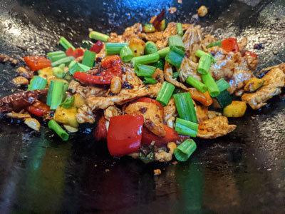 Lastly add the sliced green onion which will wilt as it is stirred into the Kung Pao chicken.
