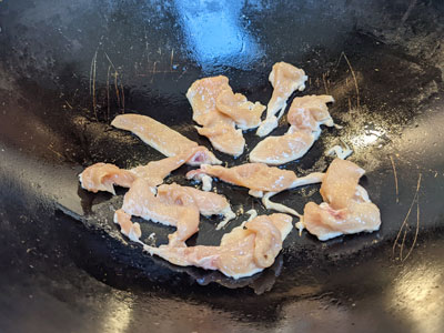 With all the prep work done it’s time to Wok! Heat your wok over high heat. I drained my marinated chicken and used paper towels to absorb some of the marinade so that the chicken would sear better when cooked. You will need to cook the chicken in batches. When the wok is hot, add a drizzle of vegetable oil and lay the chicken pieces flat in a single layer so that they will sear evenly. When they have seared on the bottom, flip them over for a minute or so to brown the other side.