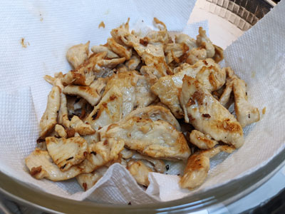 Start with slicing thin strips of a chicken breast. It’s easier to make precise cuts when the chicken is partially frozen. This large chicken breast was just over 1 pound which was just what I needed.