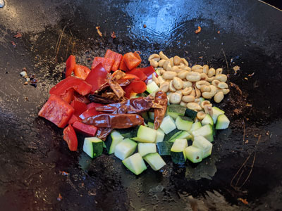 Add the zucchini, red pepper, peanuts and dried red chili’s to the pan and saute 2 – 3 minutes.