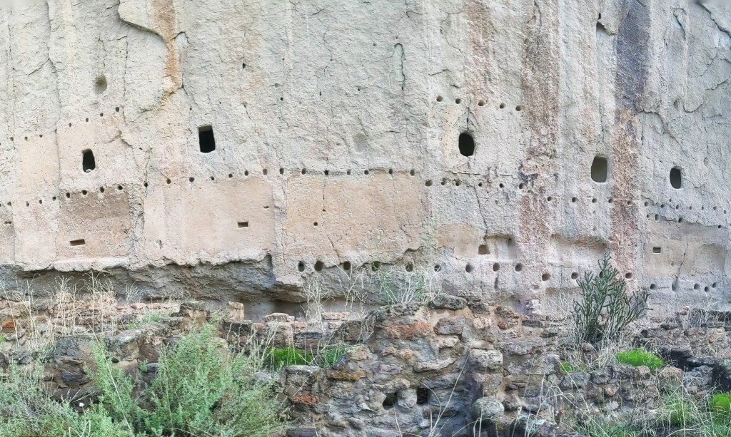 A closer look shows the pueblo home snuggled up against the high cliff. Also you can see the inside with windows and vigas.