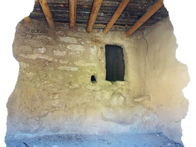 A closer look shows the pueblo home snuggled up against the high cliff. Also you can see the inside with windows and vigas.