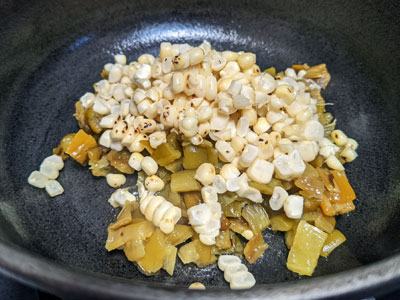 I lightly roasted an ear of corn over the open flame of my stove. I turned the corn often rotating it to lightly char all sides. Cut from the cob and add 1/2 cup to the green chile.