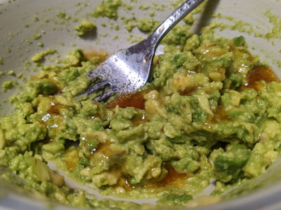 To make guacamole, mash avocado and add 2 tablespoons of miso vinaigrette. Stir together until the guacamole is smooth. It will appear thin. Set aside.