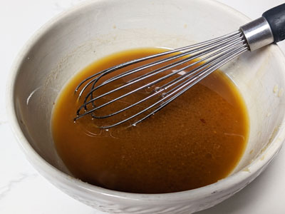 Add all the ingredients into a bowl and whisk to emulsify the vinaigrette.
