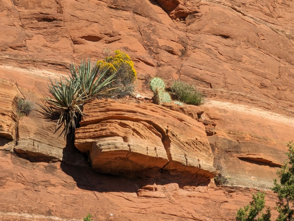 High above us on a red rock, this cactus garden grows in it’s own natural window box!
