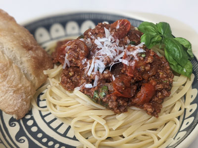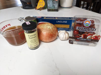 The main ingredients for the sauce include 1 pint of cherry tomatoes, onion, garlic, beef broth, tomato paste, sugar, red chile flakes and Italian seasonings. I love the Kumato tomatoes for their color, they make a gorgeous rich looking sauce. Not pictured is 1/2 pound of ground beef. You can substitute Italian sausage, ground pork or chicken for the protein. You can also add additional veggies such as mushrooms, carrots, spinach, red or yellow bell peppers, zucchini, asparagus or anything else that sounds good.