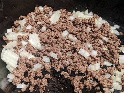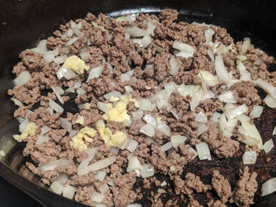 In a medium cast iron skillet, brown 1/2 pound of ground beef over medium high heat. Drain the ground beef in a strainer to remove any excess grease. Add the beef back to the skillet and toss in 1/2 cup of chopped onion. Stir the onion with the ground beef and continue to cook as the onion softens and becomes translucent.