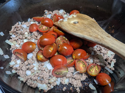 Add the cherry tomatoes that have been sliced in half and stir to combine. Place a lid on top and let the tomatoes cook down for a few minutes.