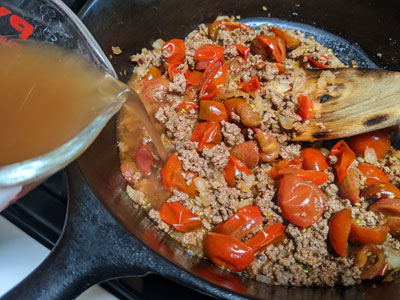 When the tomatoes soften and begin to break down, add the beef broth to the mix.