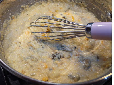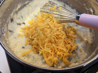 Lastly, add the grated cheese and stir until it has melted and is evenly distributed though the polenta.