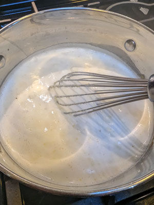 In a 3 quart or larger saucepan, heat 2 cups whole milk and 1 cup chicken broth over medium high heat. Add the garlic powder to the liquids.